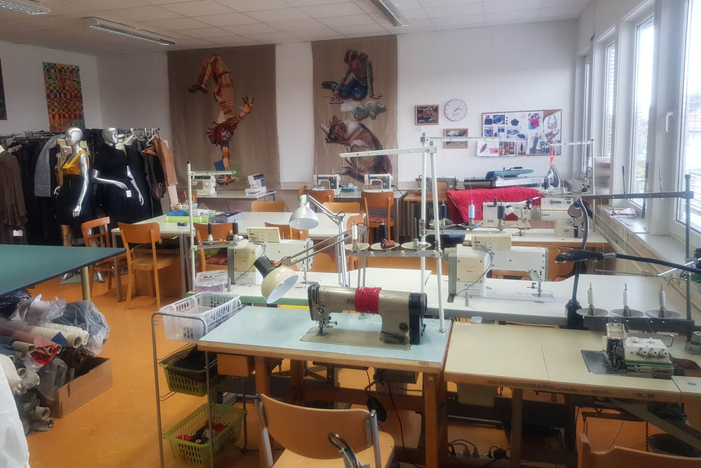 Raum 201 (Schneiderei) ist in der Hauptsache für Mode- und Textilkurse reserviert und mit zehn Haushalt- und vier professionellen Industrie-Nähmaschinen, Overlock-Maschinen, Bügelpresse, Knopfloch-Automaten, Profi-Dampfbügelstation mit Gebläse und Absaugvorrichtung sowie Zuschneidetischen, Schneirderbüsten, Kleiderständern und einem großen Stoff-/Zutaten-Assortiment ausgestattet. Eine ganzseitige Fensterfront ist ebenfalls vorhanden.