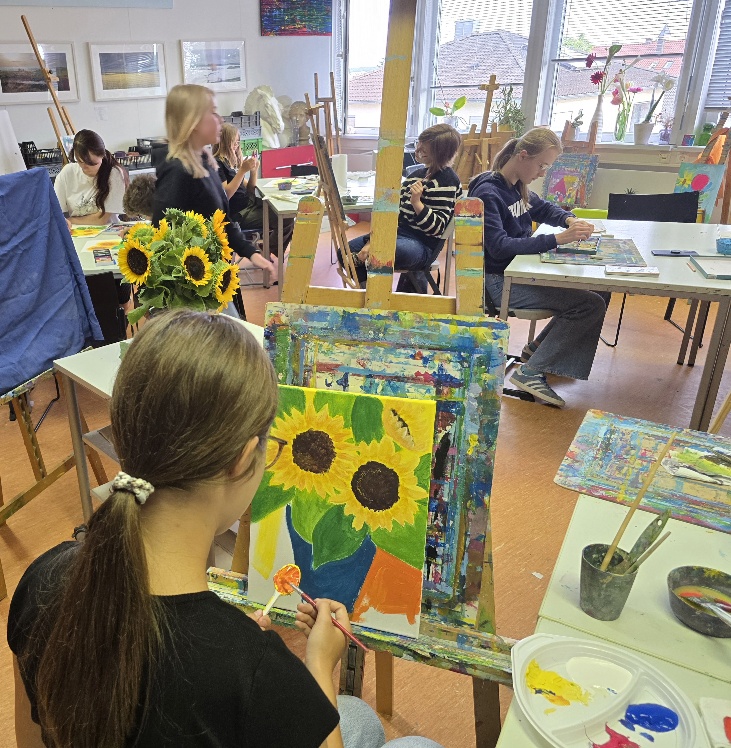 Raum 203 wird hauptsächlich für Zeichnung / Malerei / Plastisches Gestalten und Sonderkurse genutzt, ist mit Tischen und Stühlen, Staffeleien, Kunstbüchern, arrangierten Stillleben etc. ausgestattet. Eine ganzseitige Fensterfront sorgt für reichlich Tageslicht.
